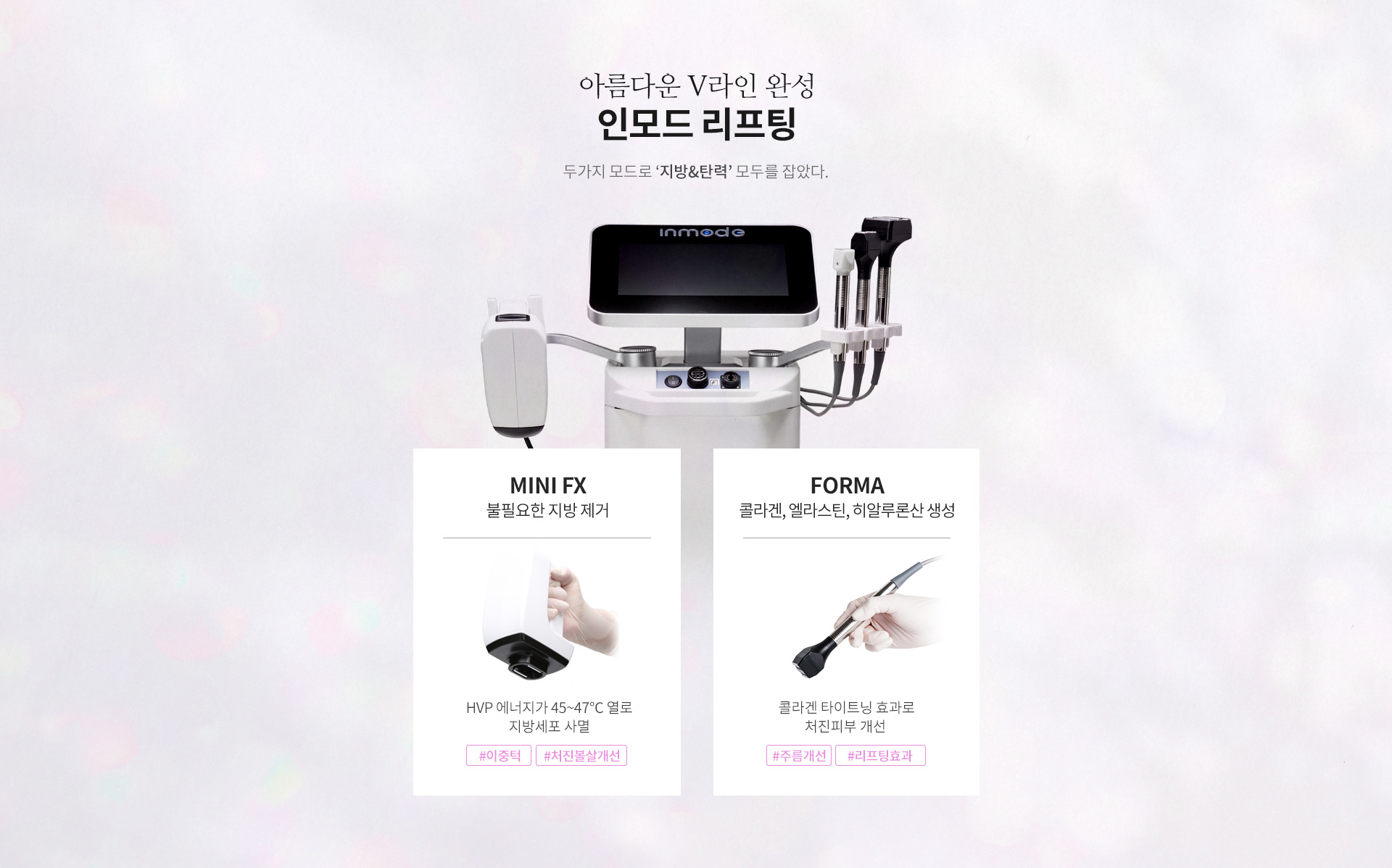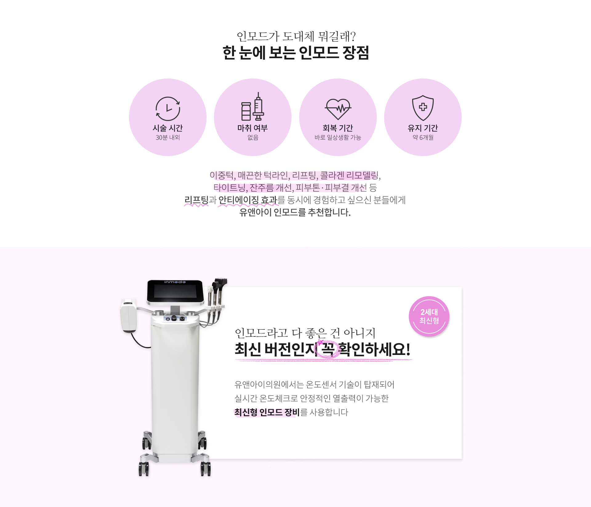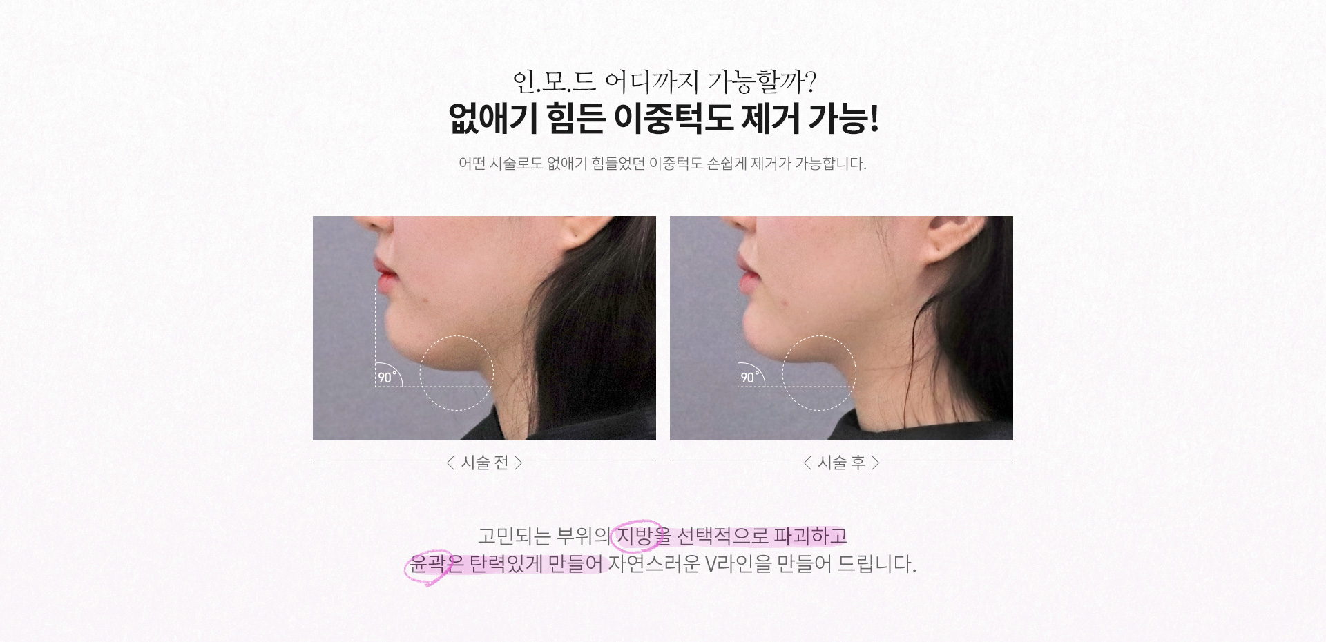 인모드는 이중턱, 잔주름 개선 등 리프팅과 안티에이징 효과를 동시에 치료해주는 시술입니다.